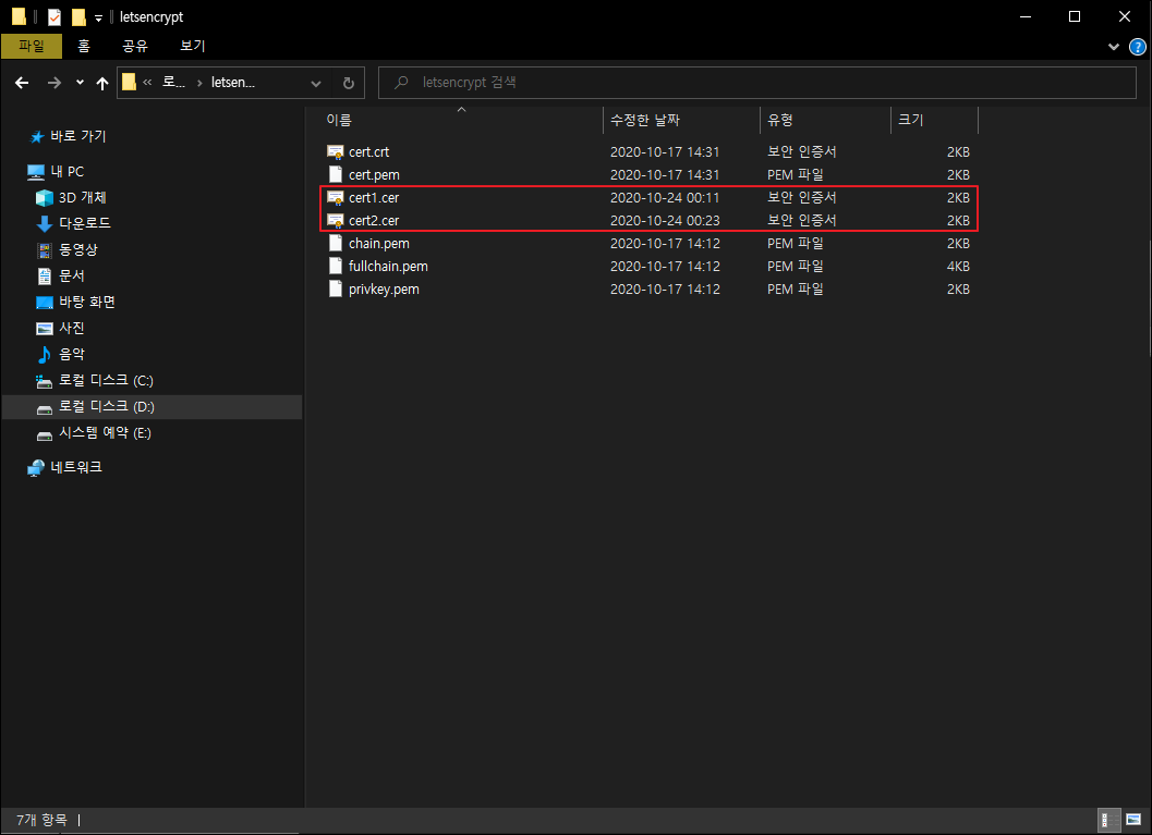 두 번의 인증서 내보내기 마법사 작업을 진행 완료 후 새로 생성된 2개의 파일 두 파일 모두 메모장으로 열어 줍니다.