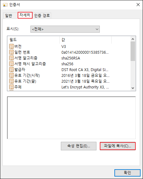 새로운 인증서 정보 창이 나오게 되며, 발급 대상 Let's Encrypt Authority X3 및 발급자 정보 DST Root CA X3가 맞는지 확인 후 자세히 탭으로 이동하여 파일에 복사를 클릭합니다. 파일에 복사를 클릭하면 아래와 같은 인증서 내보기 마법사가 시작됩니다.