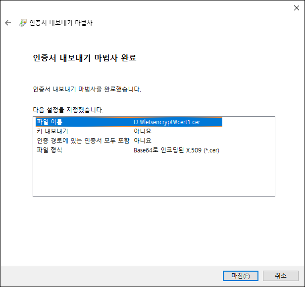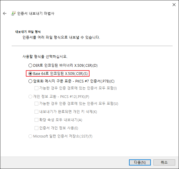 인증서 내보내기 파일 형식의 경우 반드시 "Base64로 인코딩된 X.509(.CER)"로 진행해야 합니다. 다른 인코딩으로 선택하시는 경우 Certificate Manager 서비스 LetsEncrypt 인증서가 정상적으로 업로드되지 않습니다.